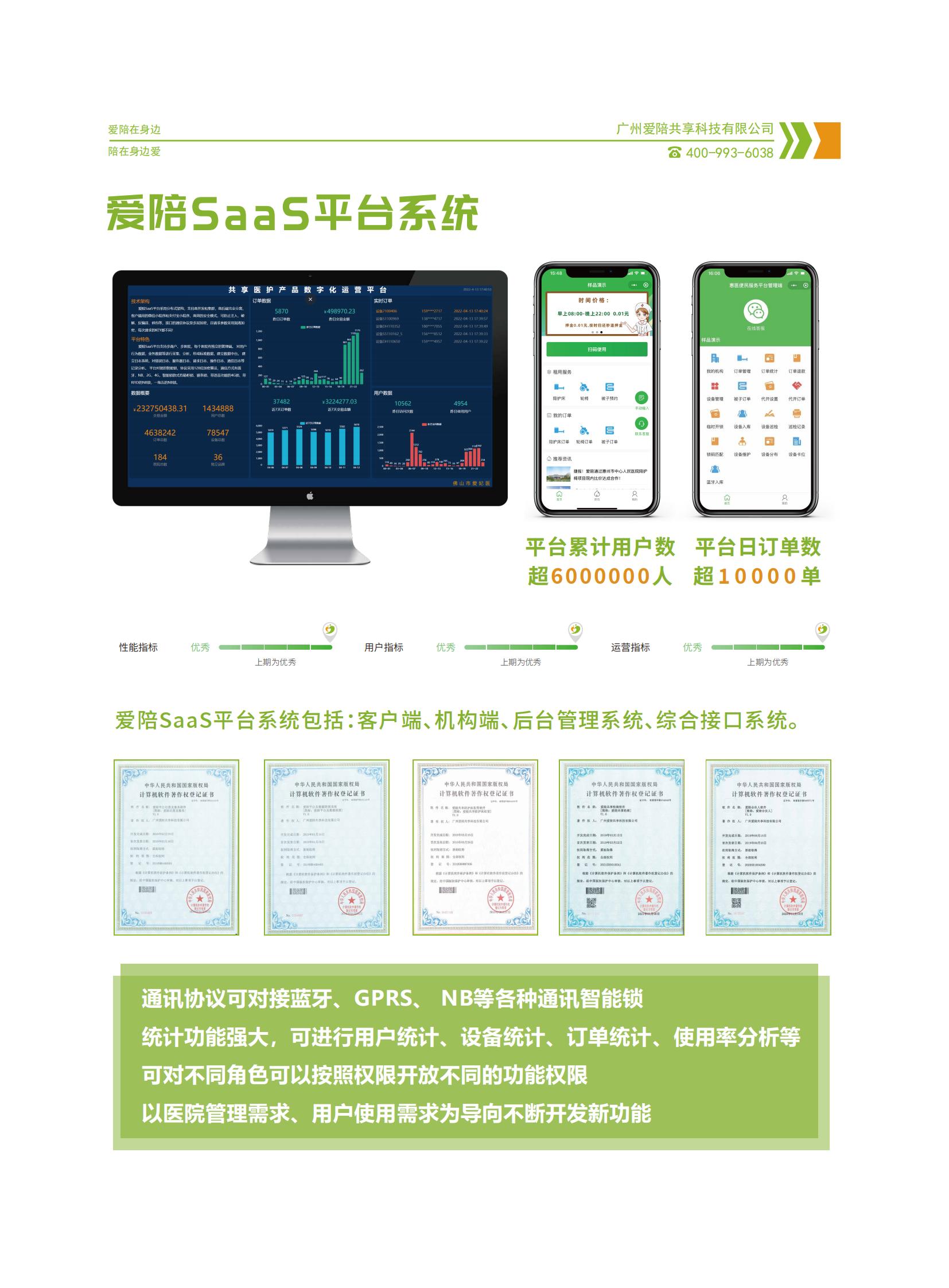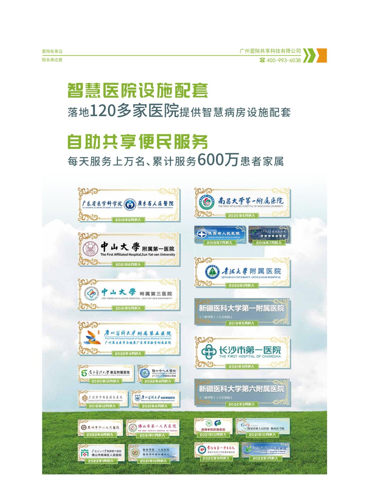 愛陪共享產(chǎn)品與服務(wù)已經(jīng)供入廣東省人民醫(yī)院、中山大學(xué)附屬第一醫(yī)院、中山大學(xué)附屬第一(南沙)醫(yī)院、中山大學(xué)附屬第三醫(yī)院嶺南醫(yī)院、南方醫(yī)科大學(xué)第五附屬醫(yī)院、廣州醫(yī)科大學(xué)附屬腫瘤醫(yī)院、廣州醫(yī)科大學(xué)附屬第五醫(yī)院、廣東省中西醫(yī)結(jié)合醫(yī)院、廣州市中西醫(yī)結(jié)合醫(yī)院、長沙市第一醫(yī)院、陜西省人民醫(yī)院、南昌大學(xué)附屬第一醫(yī)院、新疆醫(yī)科大學(xué)附屬第一醫(yī)院、第六醫(yī)院等 120 多家醫(yī)院提供智慧病房配套和智慧租賃便民服務(wù)。
